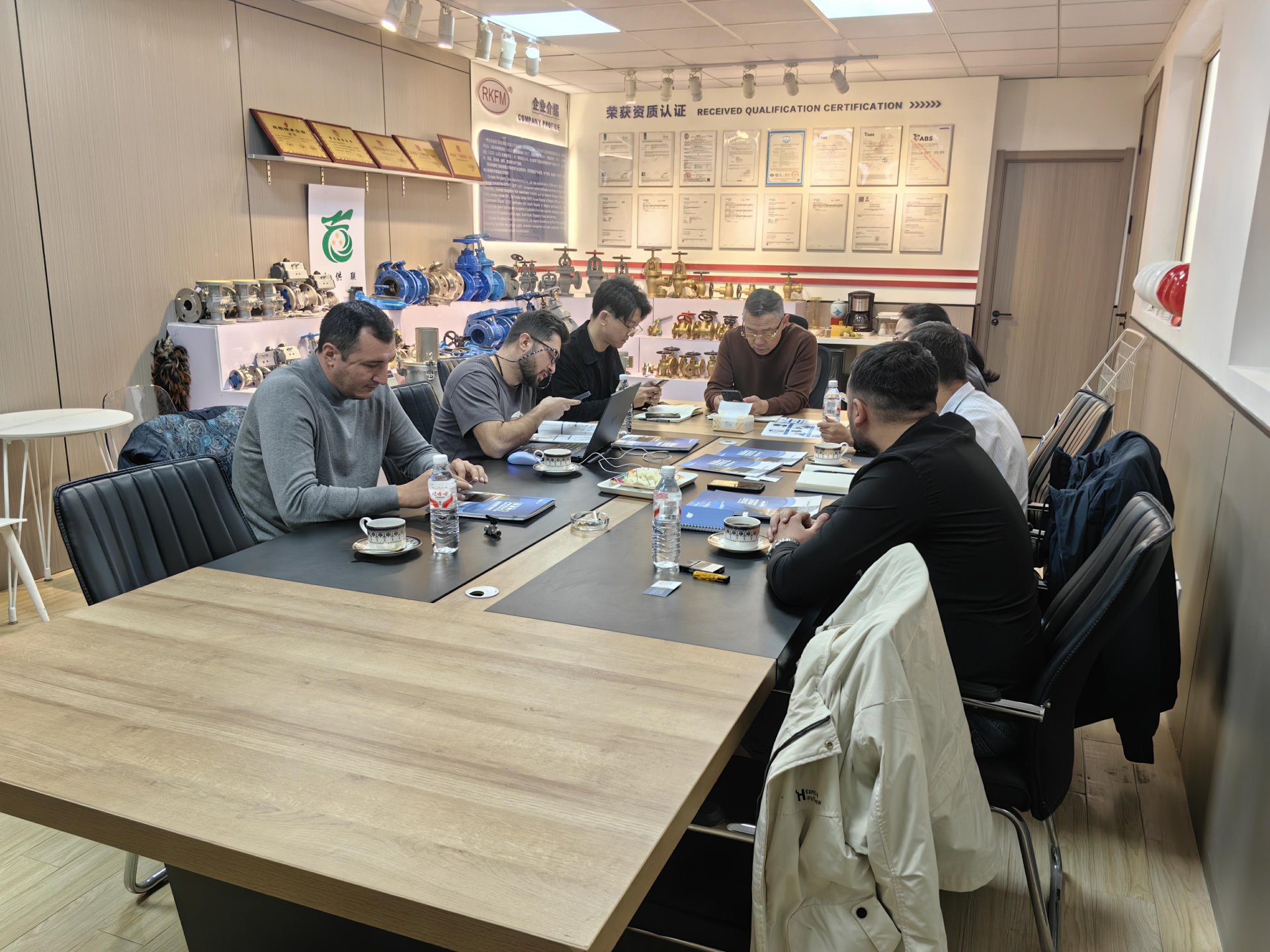Qingdao Rongkang Valve Manufacturing Co., Ltd. (hereafter "Rongkang Valve") recently welcomed a distinguished delegation of four senior leaders from Baku Shipyard LLC (Azerbaijan) to its headquarters. Mr. Wang, General Manager of Rongkang Valve, hosted the meeting, where both parties engaged in profound and fruitful strategic discussions concerning the supply of high-end marine and offshore specialized valves, fluid control system integration, and technical services.